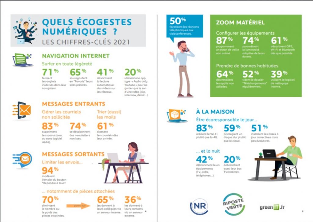 Sans relâche, Riposte Verte et GreenIt rappelle que « La digitalisation génère des impacts majeurs, notamment environnementaux, et nécessite un engagement soutenu pour les maîtriser. » La 1ère édition d’un Observatoire annuel sur Les écogestes numériques – de la navigation Internet qu’aux messages reçus et envoyés à longueur de journée – vise à évaluer les bonnes pratiques. « Au bureau, rappellent les auteurs, nos écogestes individuels sont un complément indispensable à de bonnes pratiques collectives déployées par la direction portant, outre l’écoconception logicielle, sur les processus d’achat et de traitement en fin de vie des équipements. » Sans oublier des idées d’action sur la configuration de les équipements et sur les écogestes à la maison.